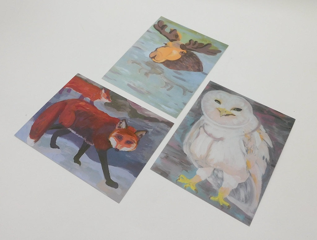 3 Postcard Designs Available: Laughing Owl, Marsh Moose, Winter Walk in Whitehorse