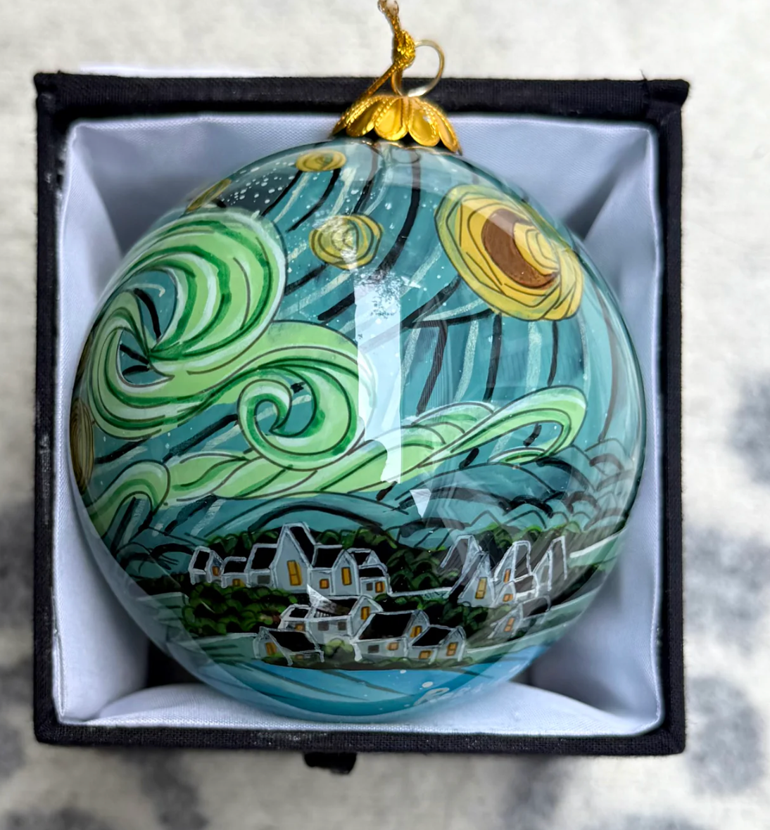 Decorate for the holidays with beautiful glass ornaments. Each is hand-painted and inspired by Robbie Craig's paintings.