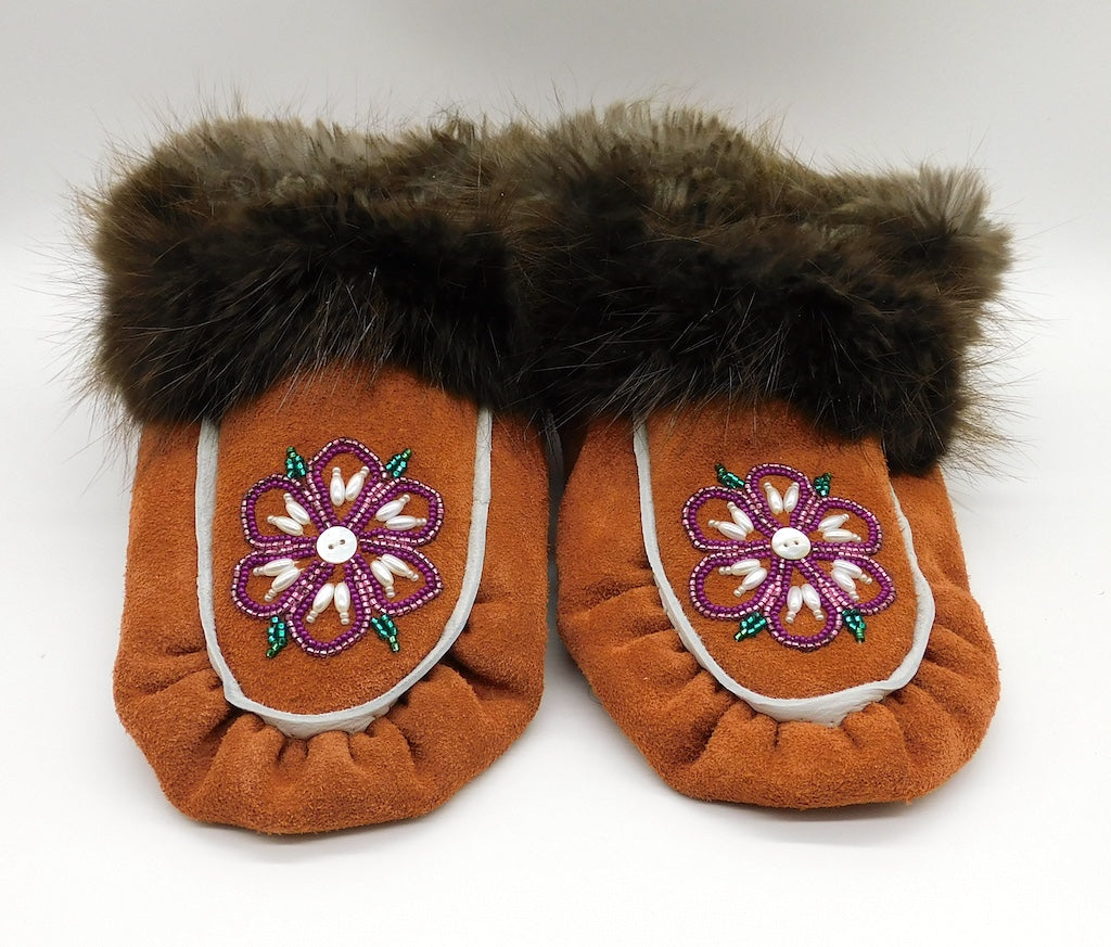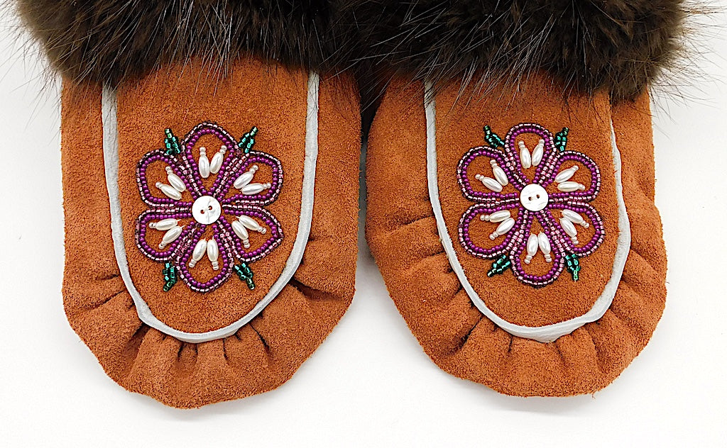 The word moccasin originates from the Algonquin language. This word was used by settlers and has come to refer to any kind of indigenous slipper. Each First Nation have their own style of slipper that have been in constant creation for generations, generally handed down through one generation teaching the next.