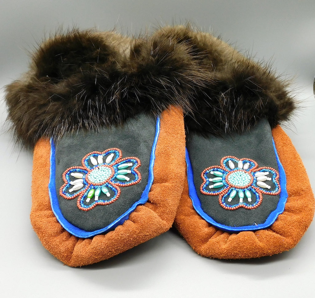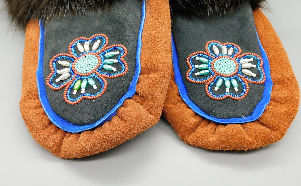 The word moccasin originates from the Algonquin language. This word was used by settlers and has come to refer to any kind of indigenous slipper. Each First Nation have their own style of slipper that have been in constant creation for generations, generally handed down through one generation teaching the next.