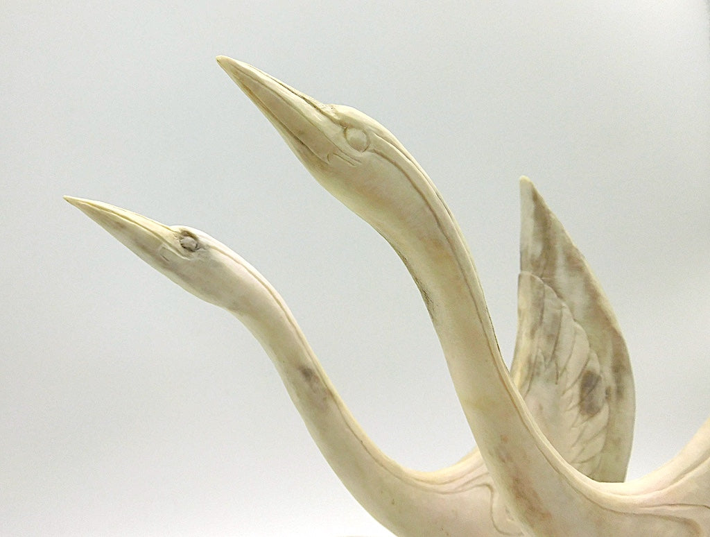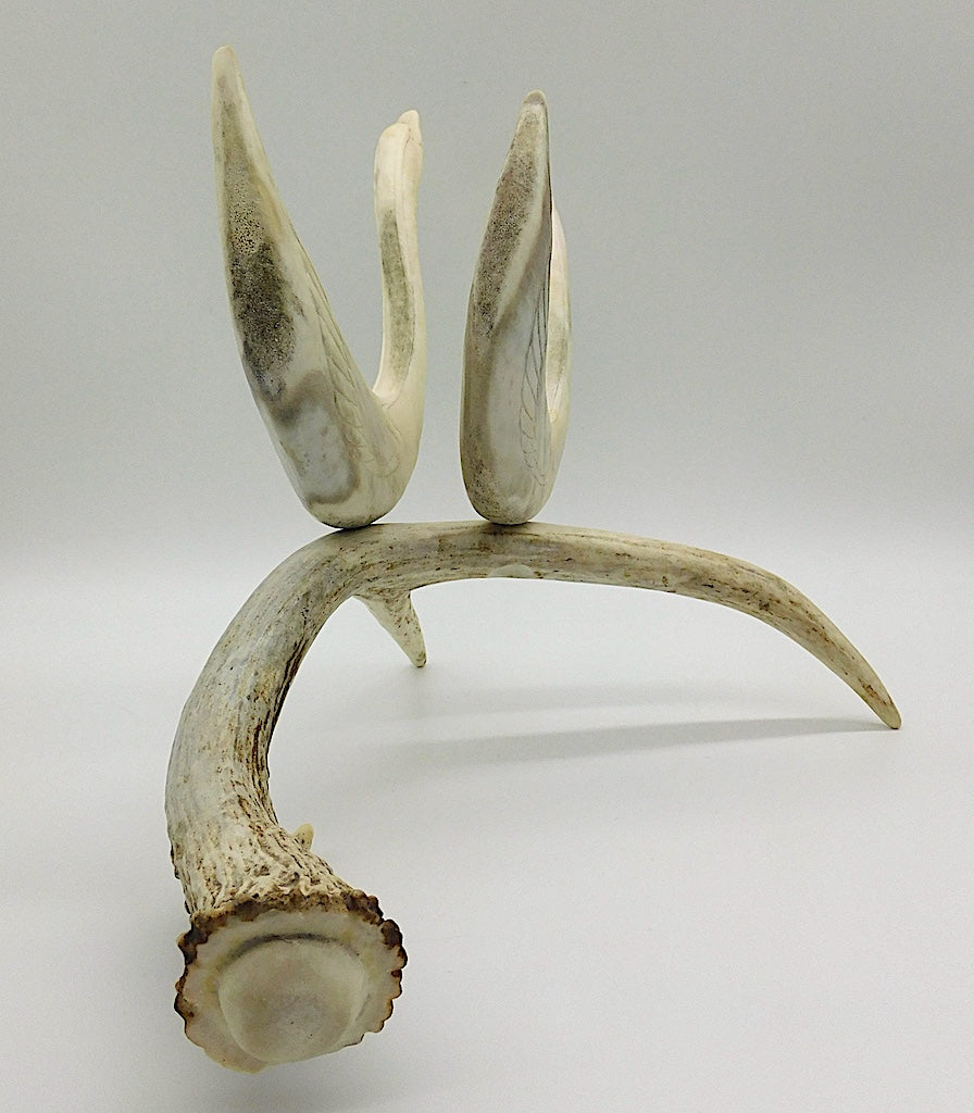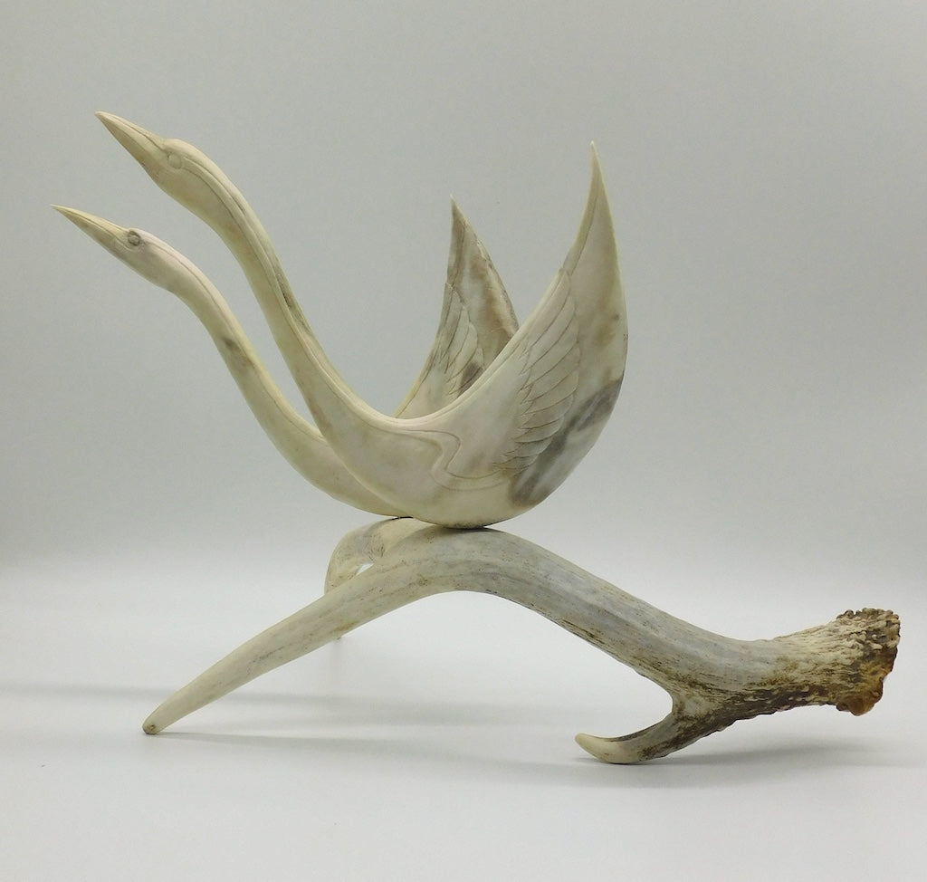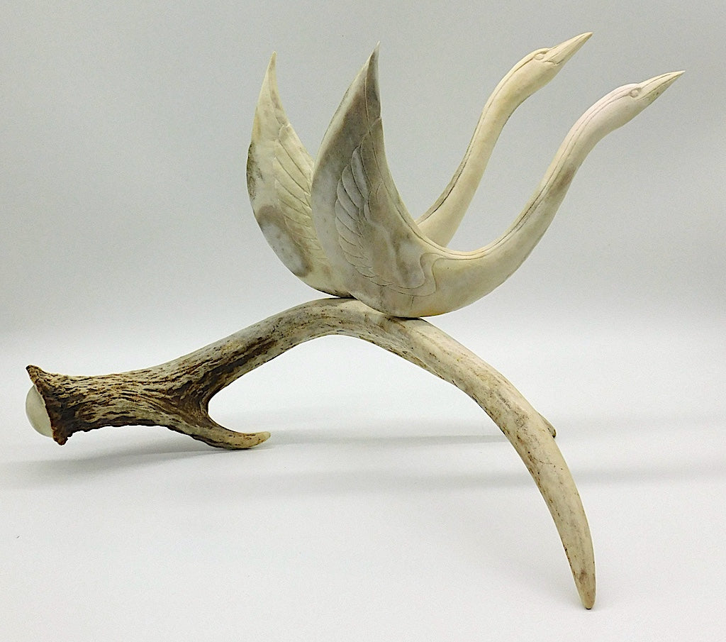 Maureen Morris has developed a very unique craft. Working in antler and bone, Maureen produces beautiful sculptures of considerable brilliance, both in design and in craftsmanship. In her strong graceful bird forms, Maureen demonstrates the carver’s unique ability to see one form inside another. A graduate of the Vancouver School of Art, Maureen initially came to the North to carve jade. However, she soon became fascinated with the potential of antler as a carving medium.