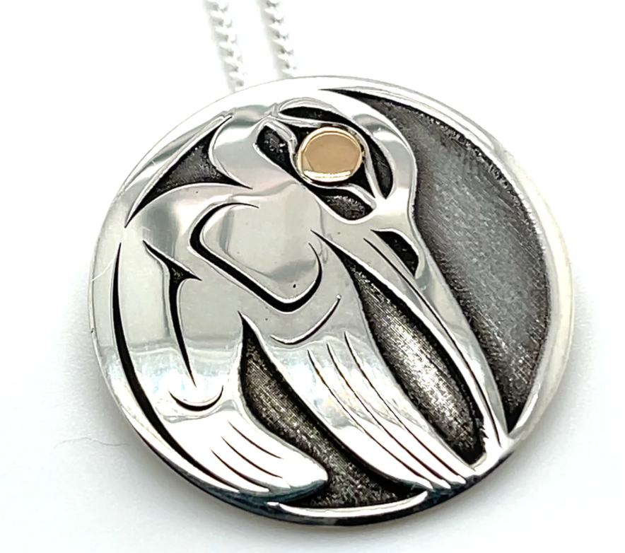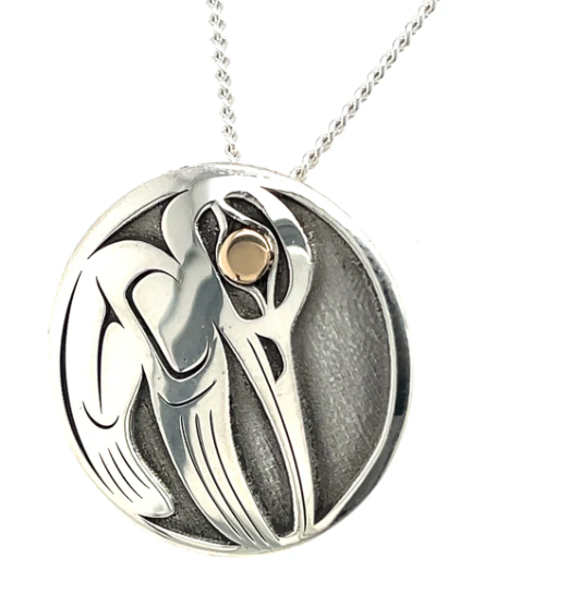 Expertly crafted in Canada, this Pendant is a stunning combination of sterling silver and 14k yellow gold. The intricate design showcases the artistry of Indigenous jewelry making. Elevate your style with this unique and beautifully made piece.