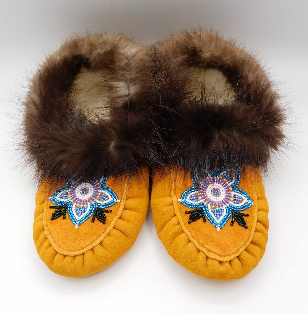 Ladies Beaded Moosehide Slippers - Flower Design Size 9