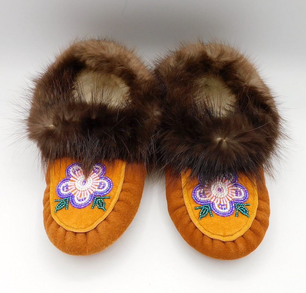 Ladies Beaded Moosehide Slippers - Flower Design Size 5