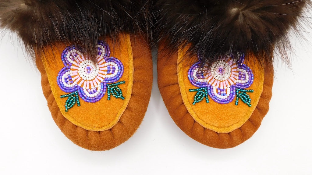 The word moccasin originates from the Algonquin language. This word was used by settlers and has come to refer to any kind of indigenous slipper. Each First Nation have their own style of slipper that have been in constant creation for generations, generally handed down through one generation teaching the next.