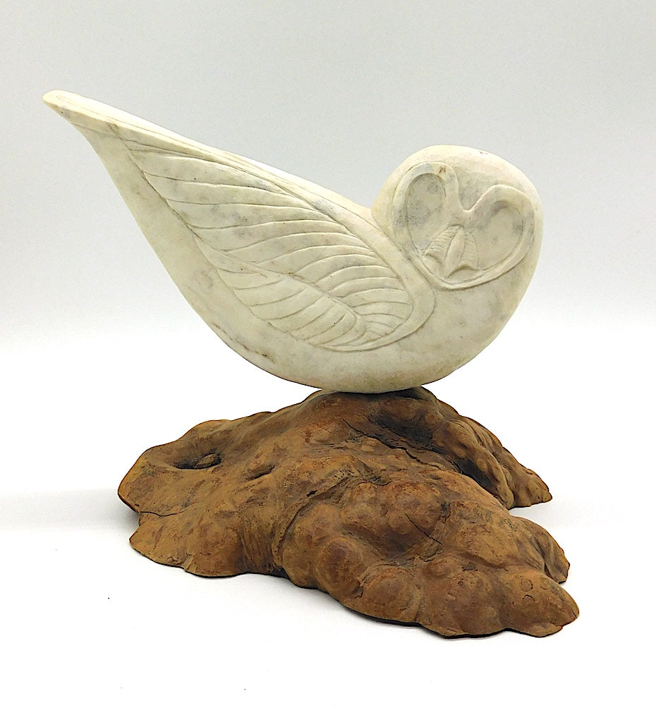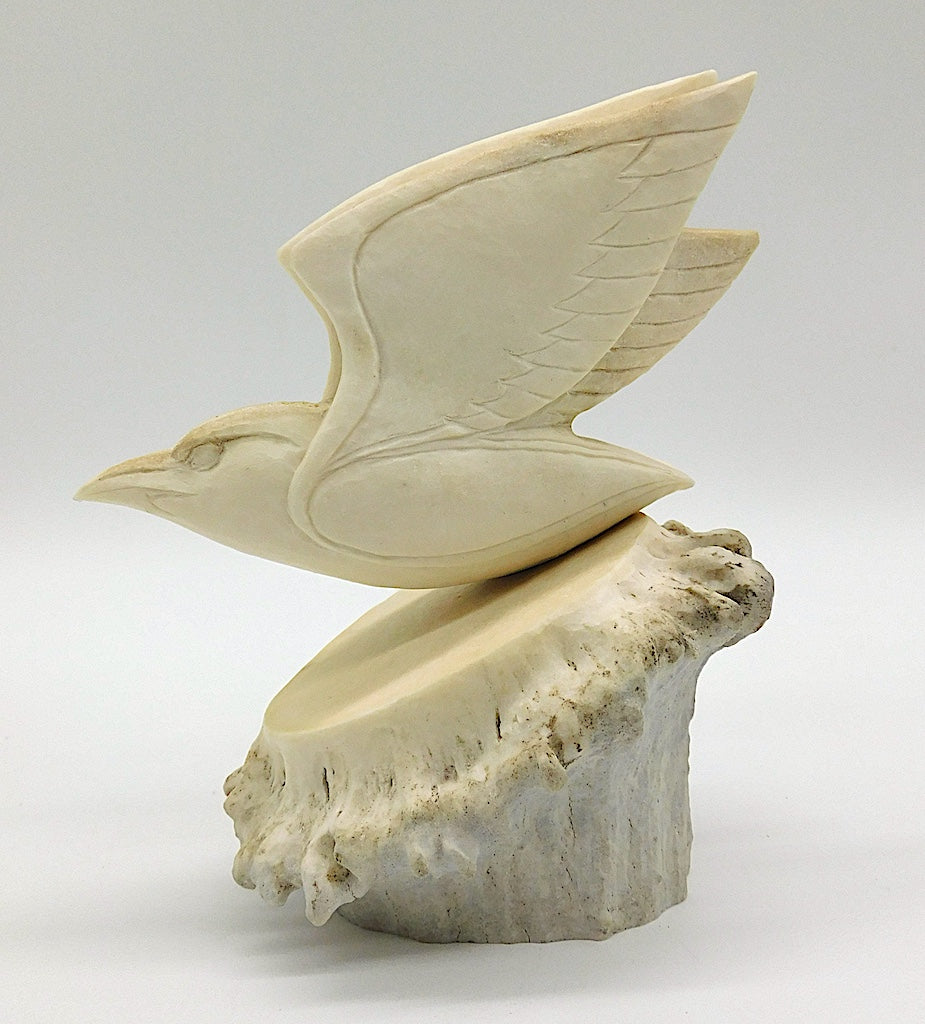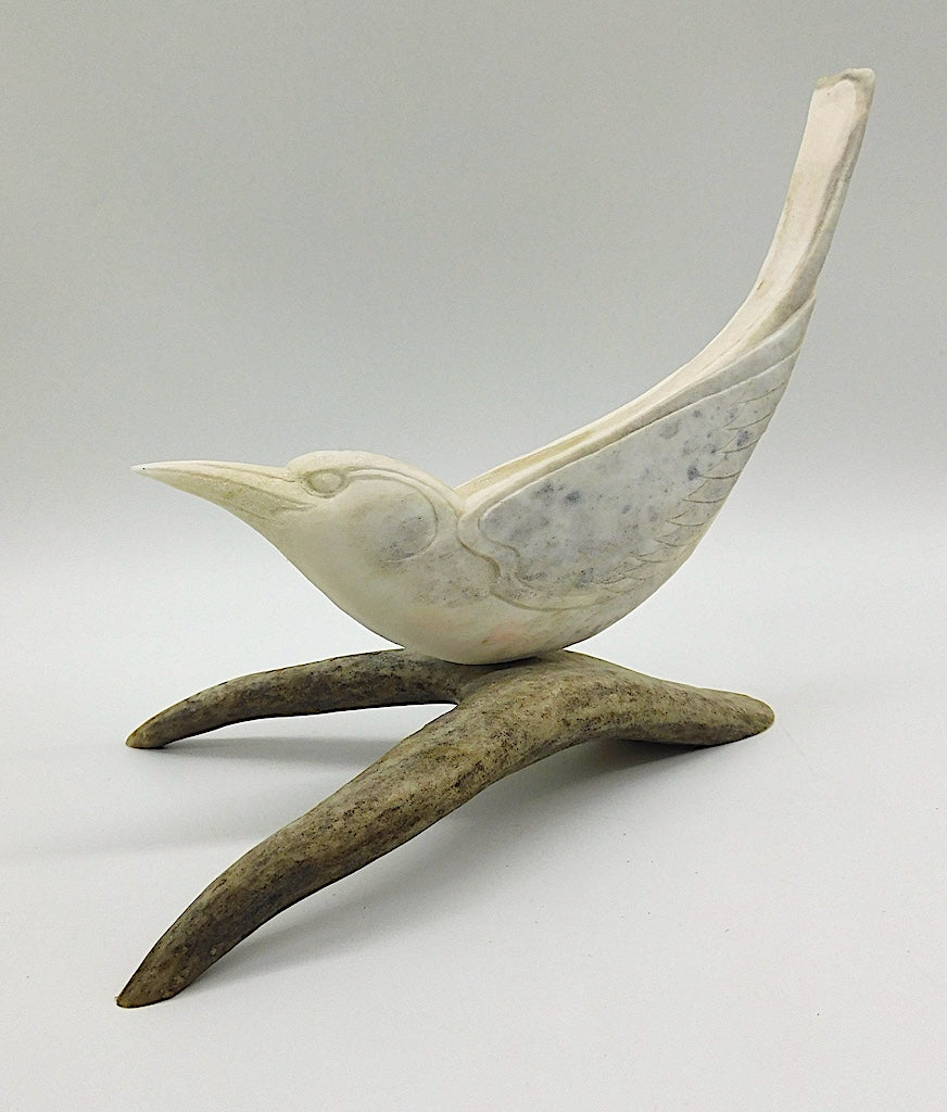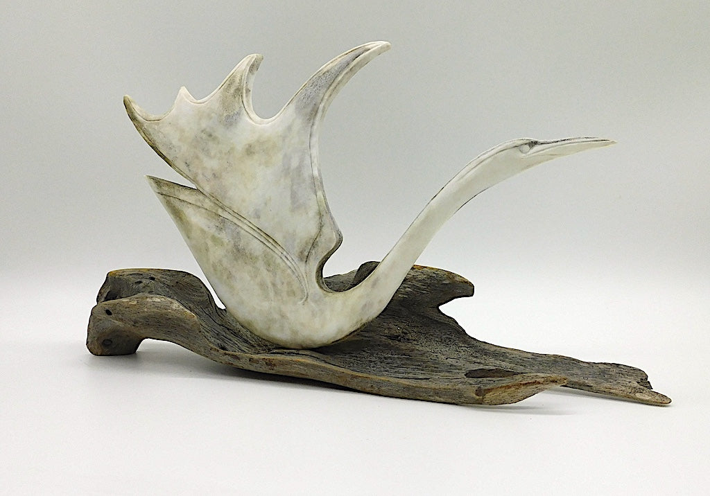 Maureen Morris of Atlin, BC has developed a very unique craft with her strong and graceful bird forms. Maureen demonstrates beautifully the carver’s unique ability to see one form inside another. A graduate of the Vancouver School of Art, Maureen initially came to the North to carve jade. However, after settling into the Northern British Columbia community of Atlin, she soon became fascinated with the potential of antler as a carving medium. Working with the material, and the lines and shapes of the antler itself, Maureen carves out an intriguing array of falcons, owls, long-neck egrets, swans and fish, as she finds their graceful lines and curves most appealing.