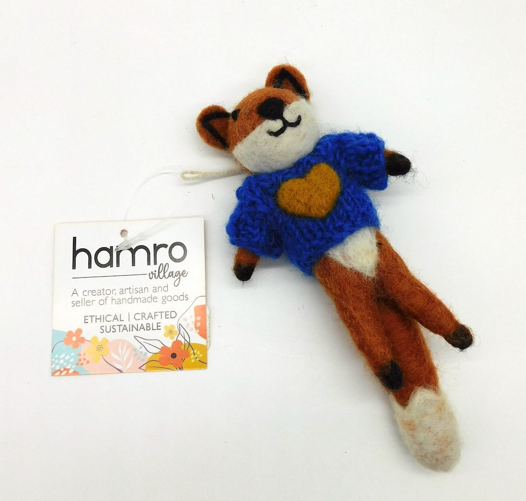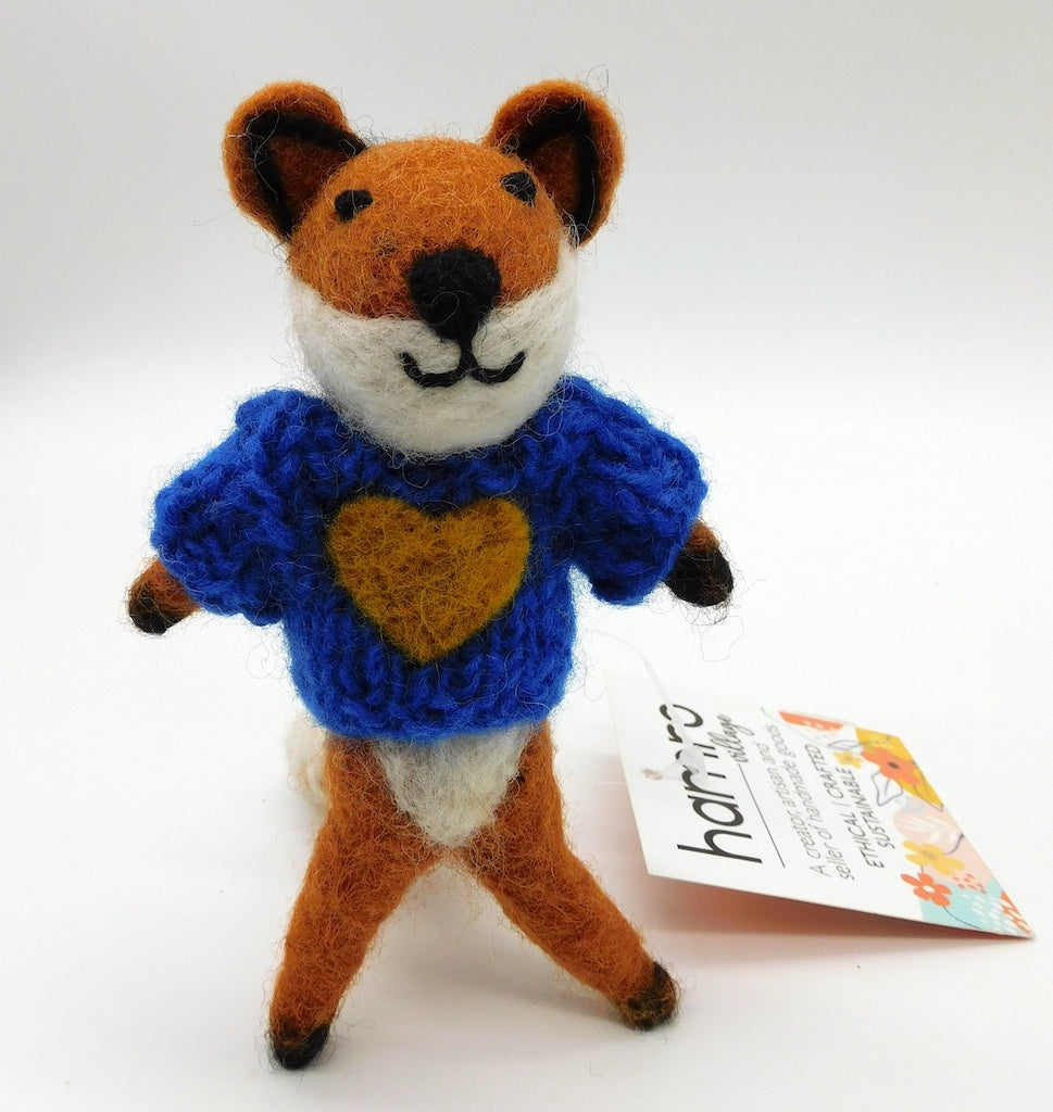 • An adorable felted fox ornament wearing a knit blue sweater with a yellow heart (Ukrainian colours)