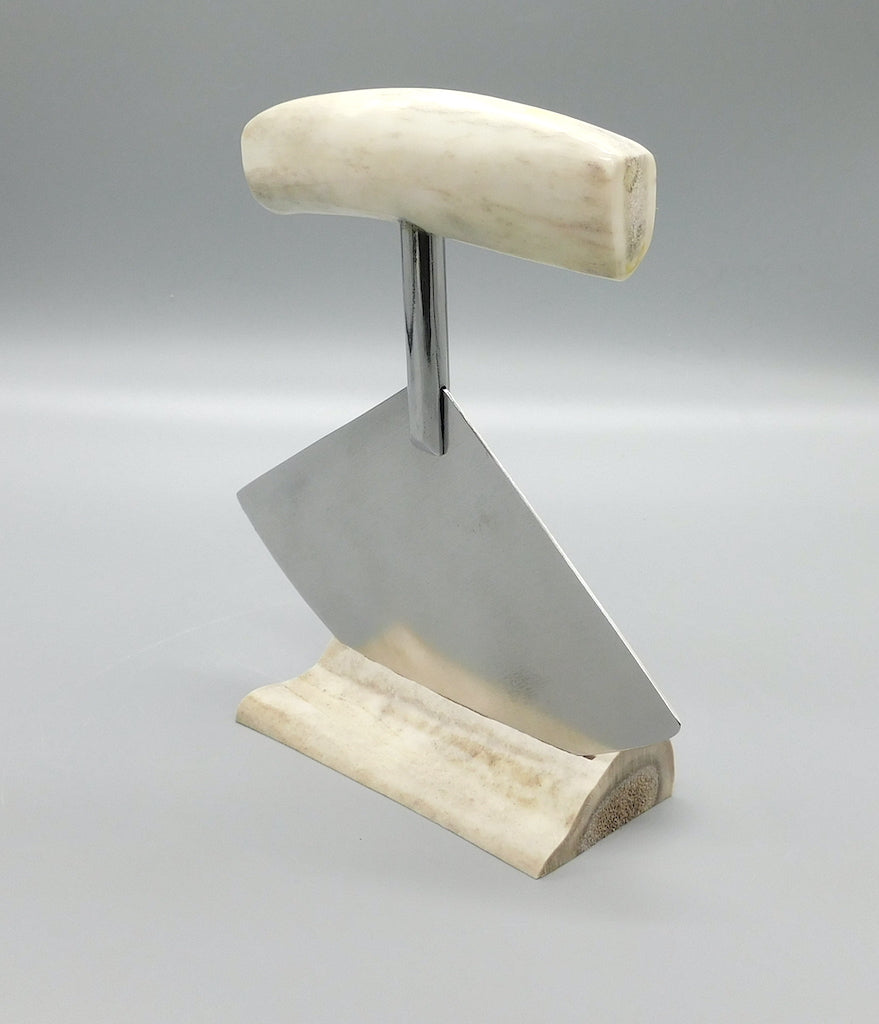 Eastern arctic style uluit (the plural of ulu) are traditional Inuit tools designed to represent the tail of a whale, sometimes they are representative of the shape of the tail, sometimes more triangular. This curved design is extremely useful for the main original purpose of skinning animals after hunting. Uluit were important tools also used by Inuit for other diverse purposes such as cutting hair, chiseling ice or snow, and preparing food. The modern Ulu is the perfect design for chopping herbs in the kitchen. It is said that the knowledge of the ancestor would be contained within it, making it stronger, therefore the Uluit were handed down through generations to preserve and strengthen this knowledge. These Uluit are decorative and functional.