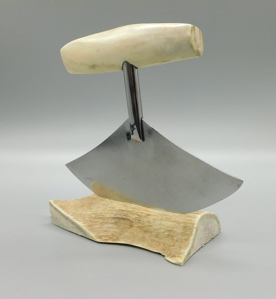 Eastern arctic style uluit (the plural of ulu) are traditional Inuit knives designed to represent the tail of a whale, sometimes they are representative of the shape of the tail, sometimes more triangular. This curved design is extremely useful for the main original purpose of skinning animals after hunting. Uluit were important tools also used by Inuit for other diverse purposes such as cutting hair, chiseling ice or snow, and preparing food. The modern Ulu is the perfect design for chopping herbs in the kitchen. It is said that the knowledge of the ancestor that used the knife would be contained within it, making it stronger, therefore the Uluit were handed down through generations to preserve and strengthen this knowledge. These Uluit are decorative and functional.