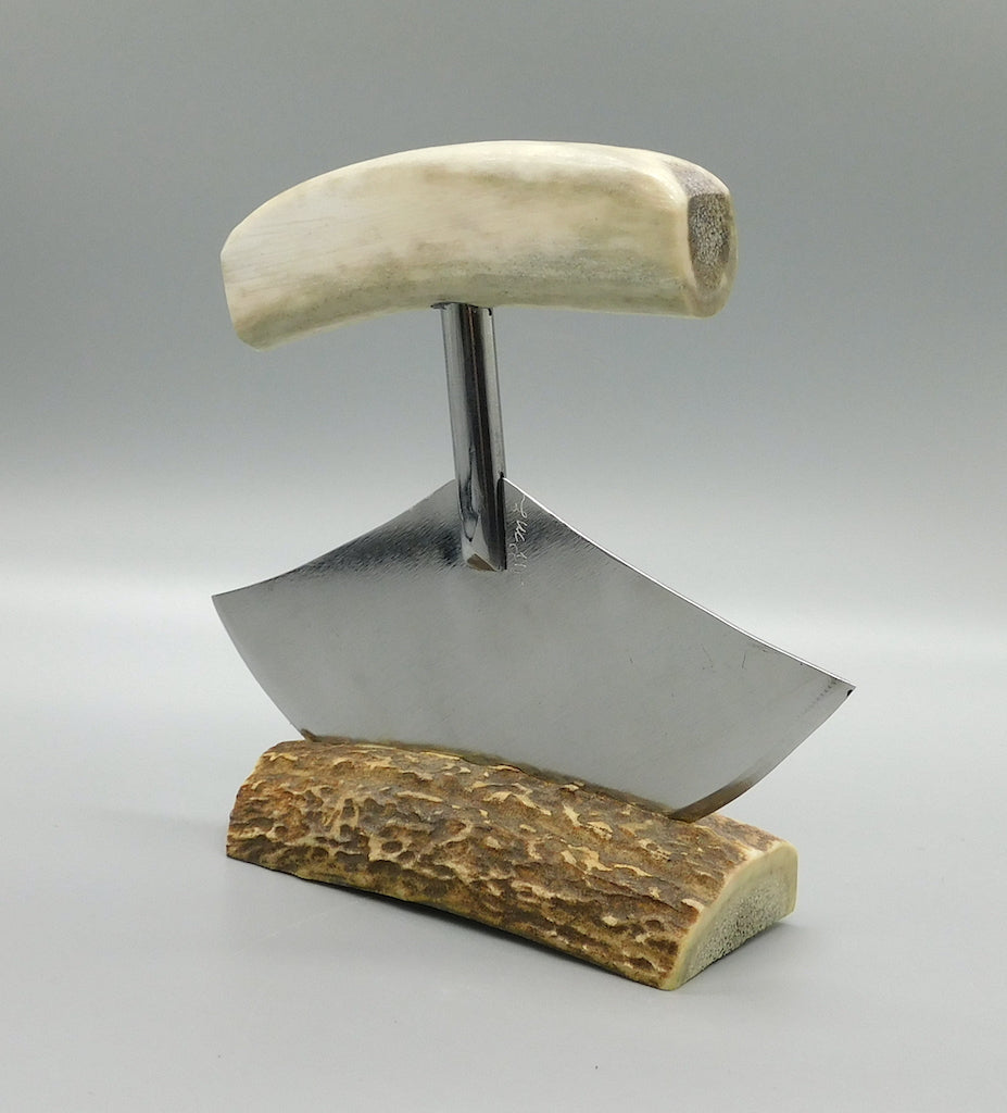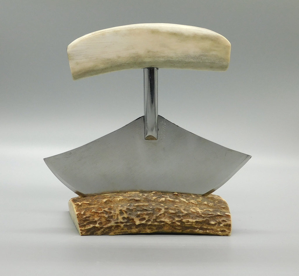 Eastern arctic style uluit (the plural of ulu) are traditional Inuit knives designed to represent the tail of a whale, sometimes they are representative of the shape of the tail, sometimes more triangular. This curved design is extremely useful for the main original purpose of skinning animals after hunting. Uluit were important tools also used by Inuit for other diverse purposes such as cutting hair, chiseling ice or snow, and preparing food. The modern Ulu is the perfect design for chopping herbs in the kitchen. It is said that the knowledge of the ancestor that used the knife would be contained within it, making it stronger, therefore the Uluit were handed down through generations to preserve and strengthen this knowledge. These Uluit are decorative and functional.