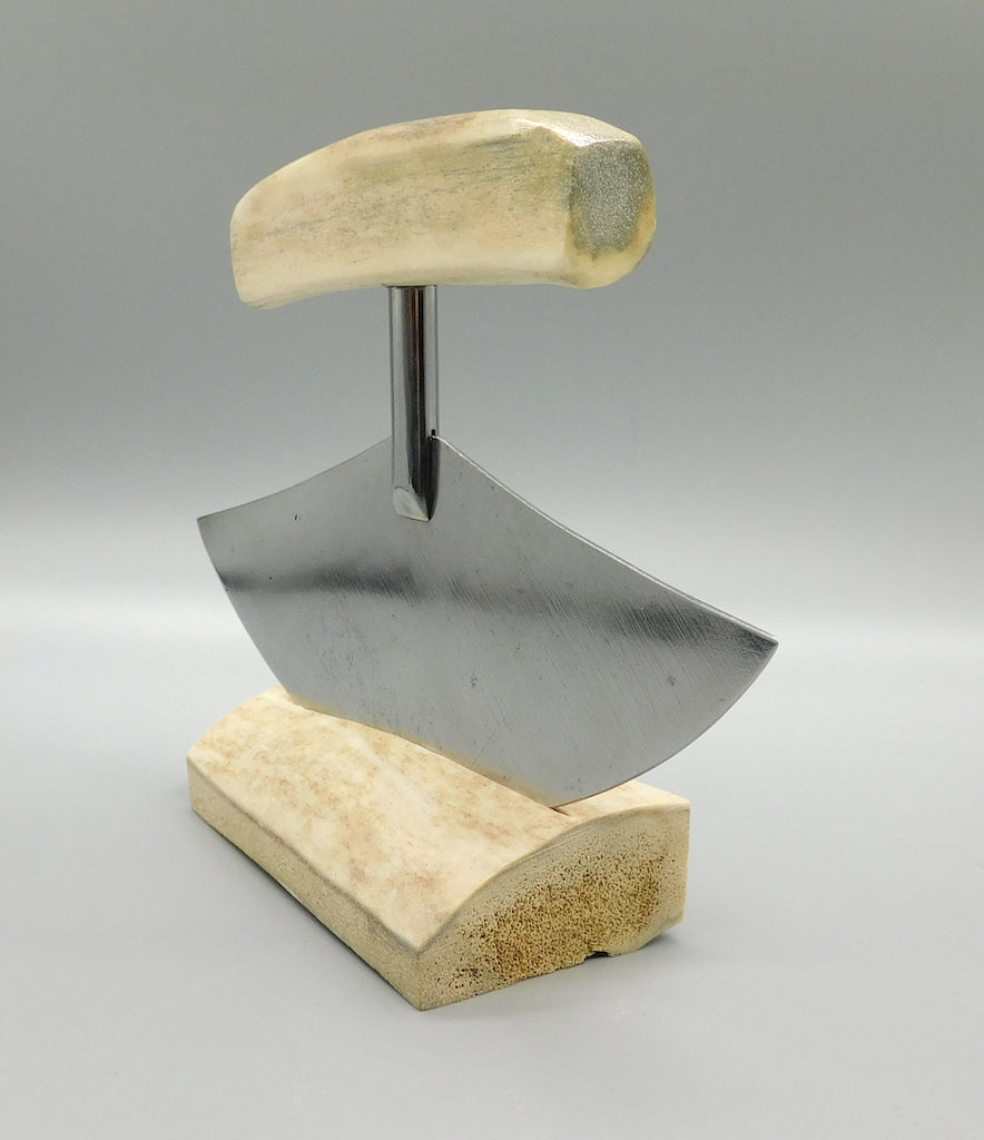 Eastern arctic style uluit (the plural of ulu) are traditional Inuit knives designed to represent the tail of a whale, sometimes they are representative of the shape of the tail, sometimes more triangular. This curved design is extremely useful for the main original purpose of skinning animals after hunting. Uluit were important tools also used by Inuit for other diverse purposes such as cutting hair, chiseling ice or snow, and preparing food. The modern Ulu is the perfect design for chopping herbs in the kitchen. It is said that the knowledge of the ancestor that used the knife would be contained within it, making it stronger, therefore the Uluit were handed down through generations to preserve and strengthen this knowledge. These Uluit are decorative and functional.