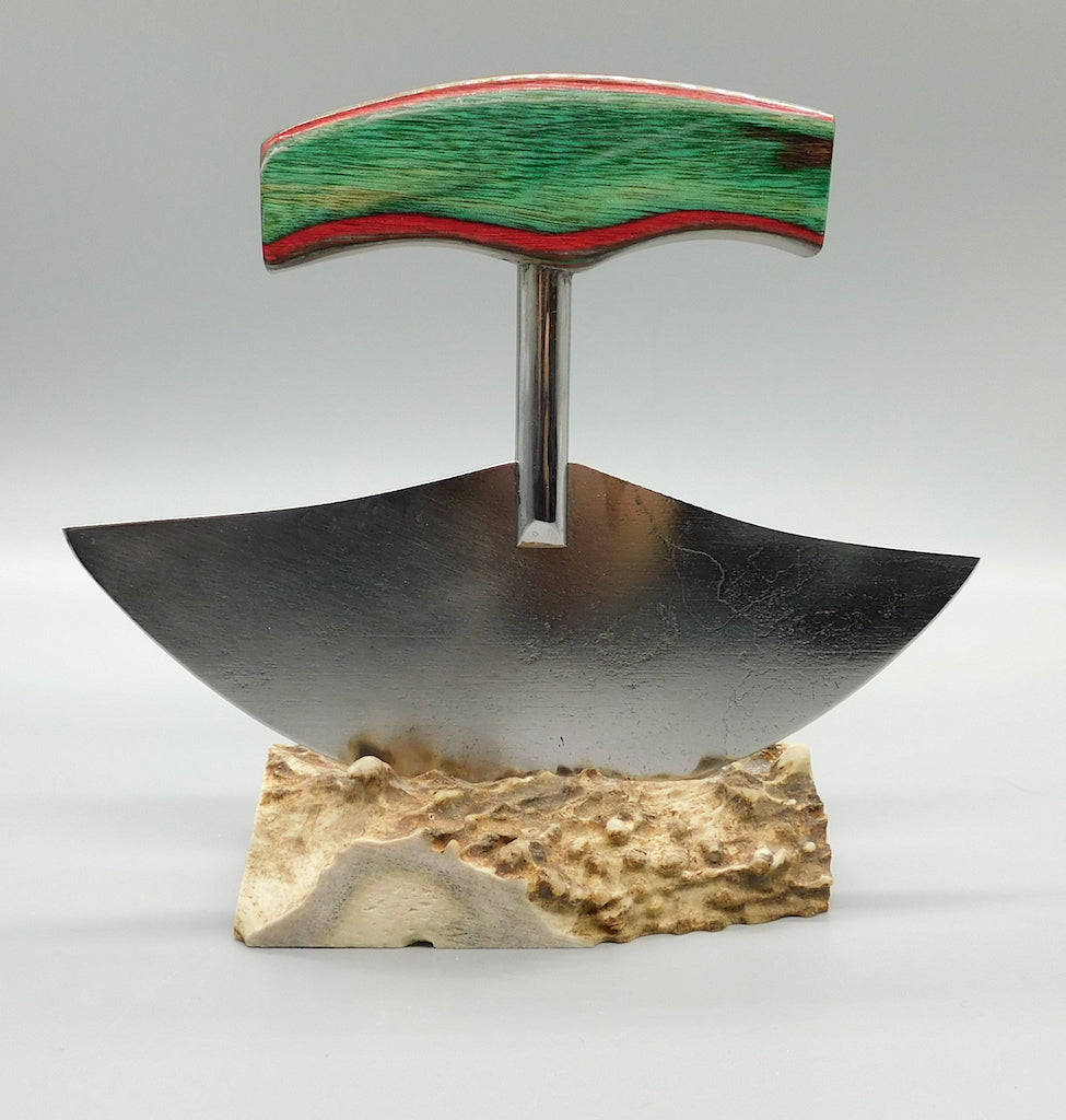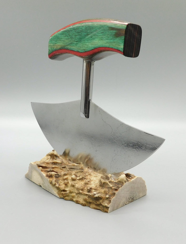 Eastern arctic style uluit (the plural of ulu) are traditional Inuit knives designed to represent the tail of a whale, sometimes they are representative of the shape of the tail, sometimes more triangular. This curved design is extremely useful for the main original purpose of skinning animals after hunting. Uluit were important tools also used by Inuit for other diverse purposes such as cutting hair, chiseling ice or snow, and preparing food. The modern Ulu is the perfect design for chopping herbs in the kitchen. It is said that the knowledge of the ancestor that used the knife would be contained within it, making it stronger, therefore the Uluit were handed down through generations to preserve and strengthen this knowledge. These Uluit are decorative and functional.