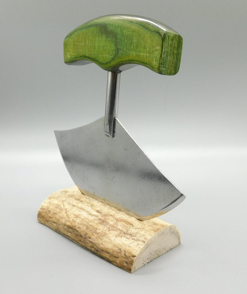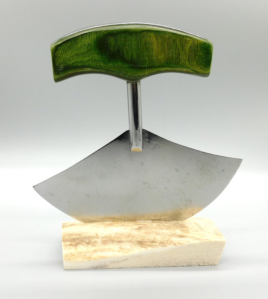 Eastern arctic style uluit (the plural of ulu) are traditional Inuit knives designed to represent the tail of a whale, sometimes they are representative of the shape of the tail, sometimes more triangular. This curved design is extremely useful for the main original purpose of skinning animals after hunting. Uluit were important tools also used by Inuit for other diverse purposes such as cutting hair, chiseling ice or snow, and preparing food. The modern Ulu is the perfect design for chopping herbs in the kitchen. It is said that the knowledge of the ancestor that used the knife would be contained within it, making it stronger, therefore the Uluit were handed down through generations to preserve and strengthen this knowledge. These Uluit are decorative and functional.