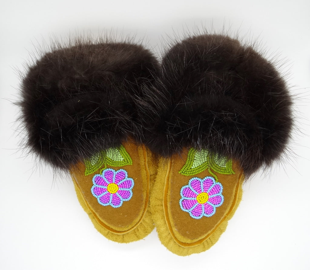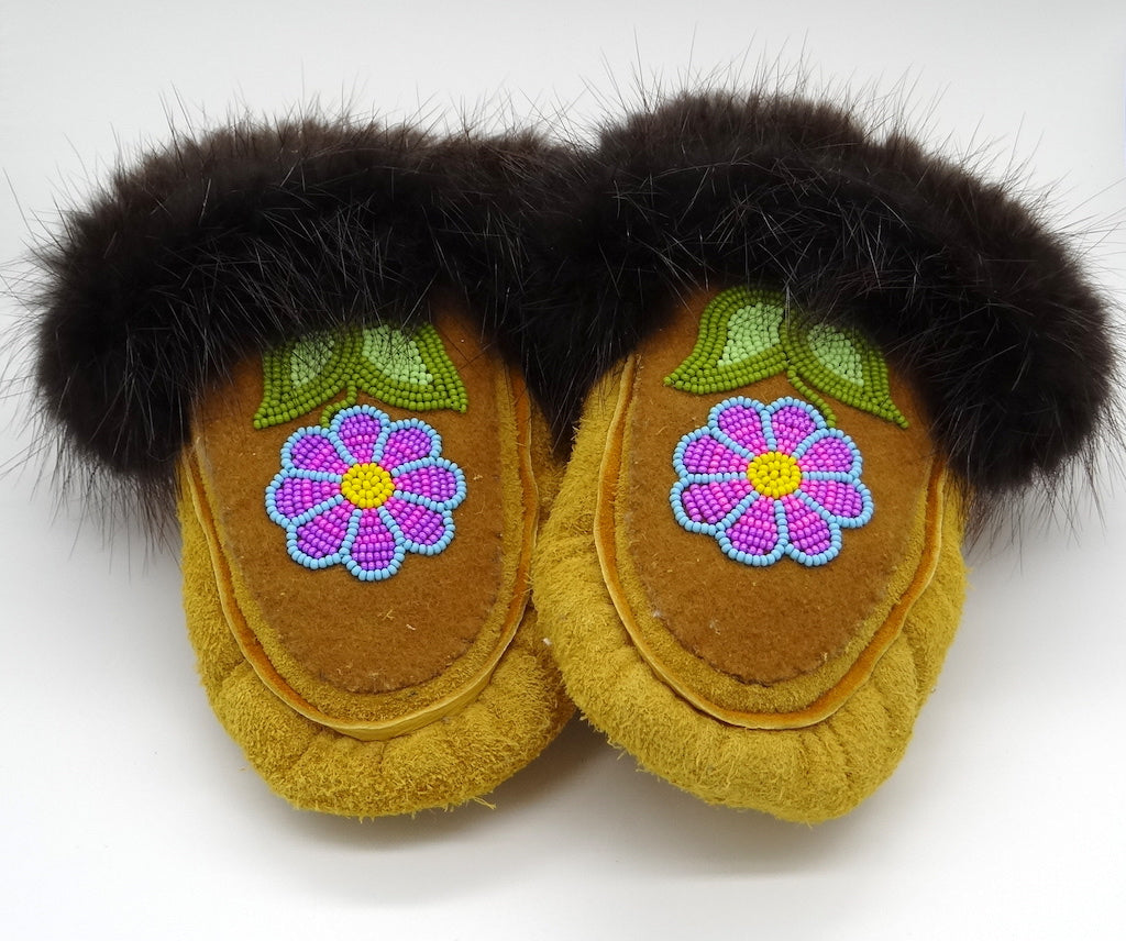 The word moccasin originates from the Algonquin language. This word was used by settlers and has come to refer to any kind of indigenous slipper. Each First Nation have their own style of slipper that have been in constant creation for generations, generally handed down through one generation teaching the next.