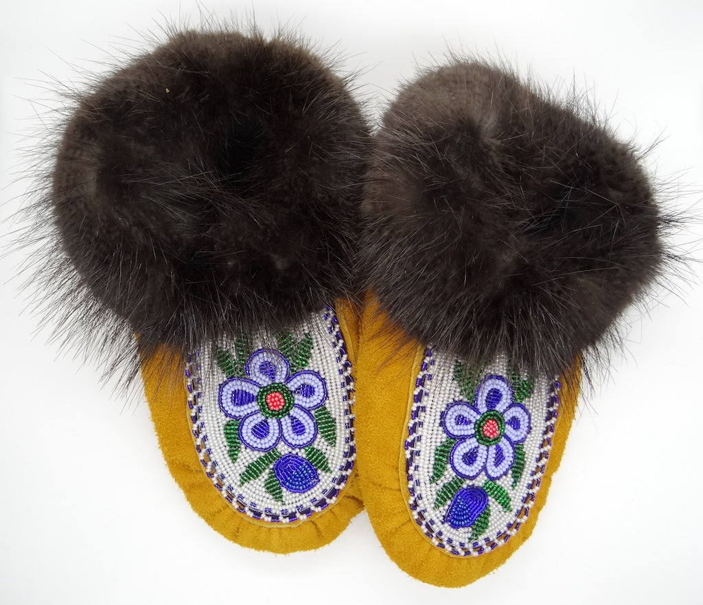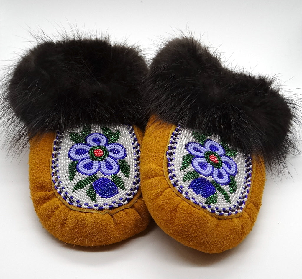 The word moccasin originates from the Algonquin language. This word was used by settlers and has come to refer to any kind of indigenous slipper. Each First Nation have their own style of slipper that have been in constant creation for generations, generally handed down through one generation teaching the next.