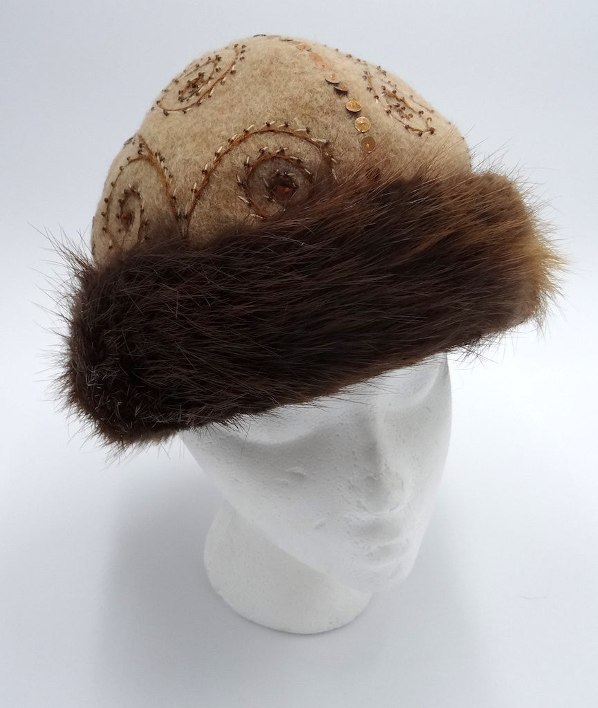 • Beaver Trimmed /Sequinned Tan Coloured Felt