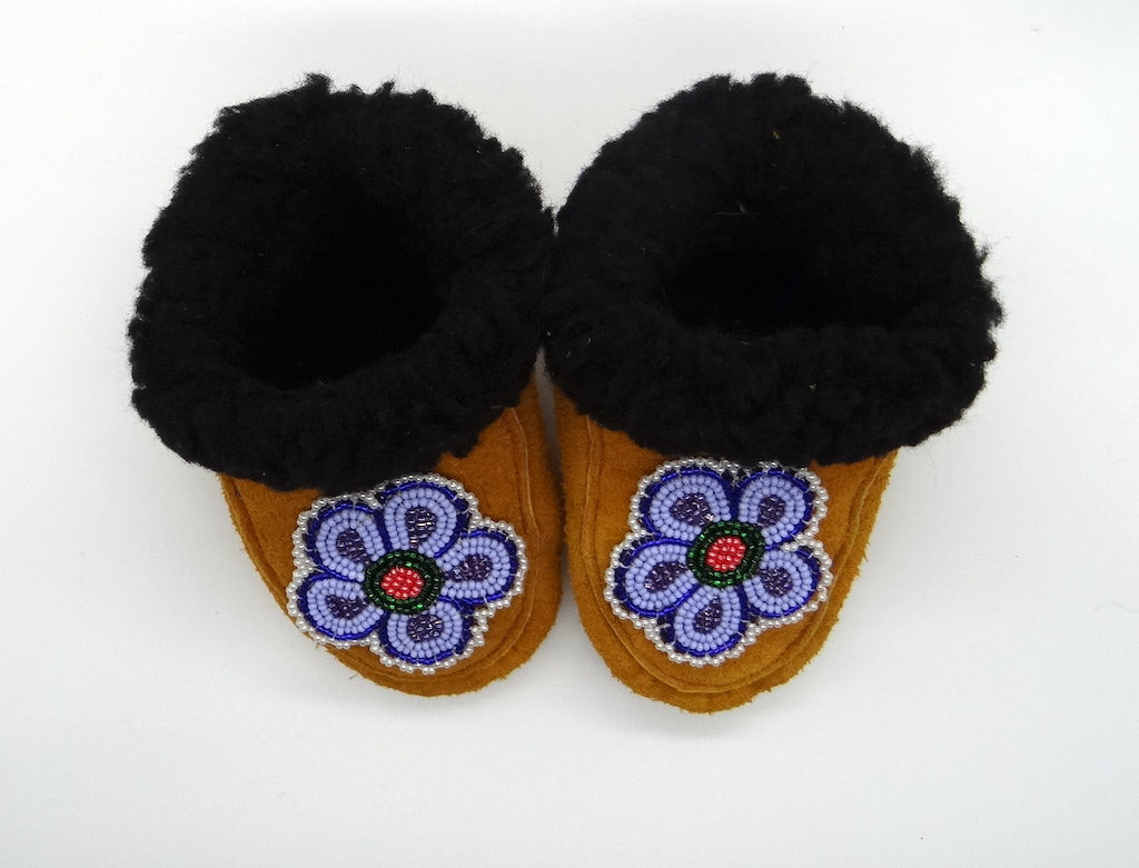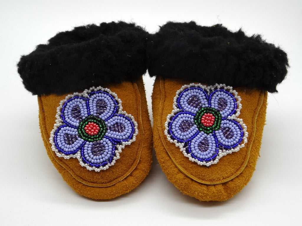 The word moccasin originates from the Algonquin language. This word was used by settlers and has come to refer to any kind of indigenous slipper. Each First Nation have their own style of slipper that have been in constant creation for generations, generally handed down through one generation teaching the next.
