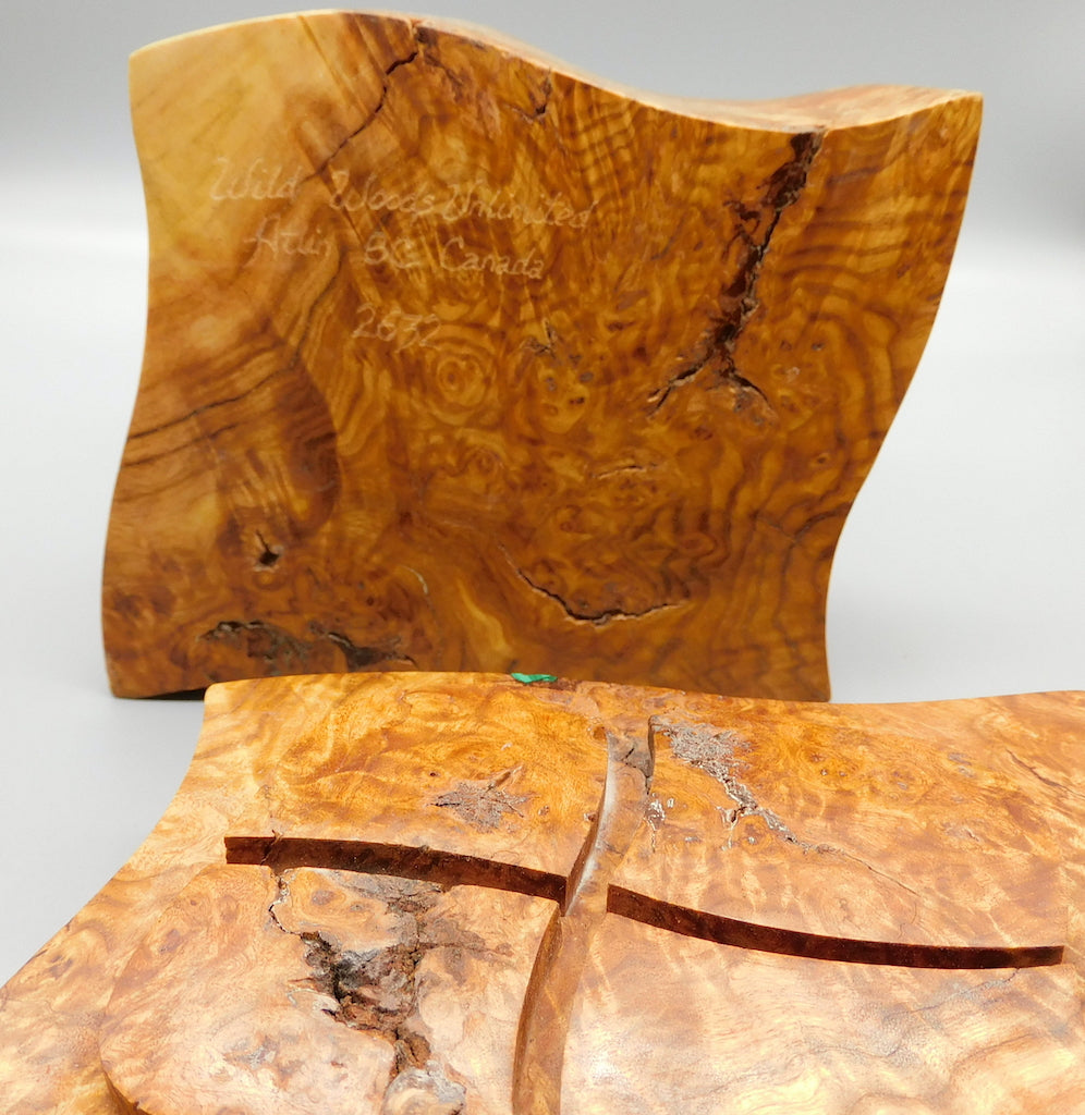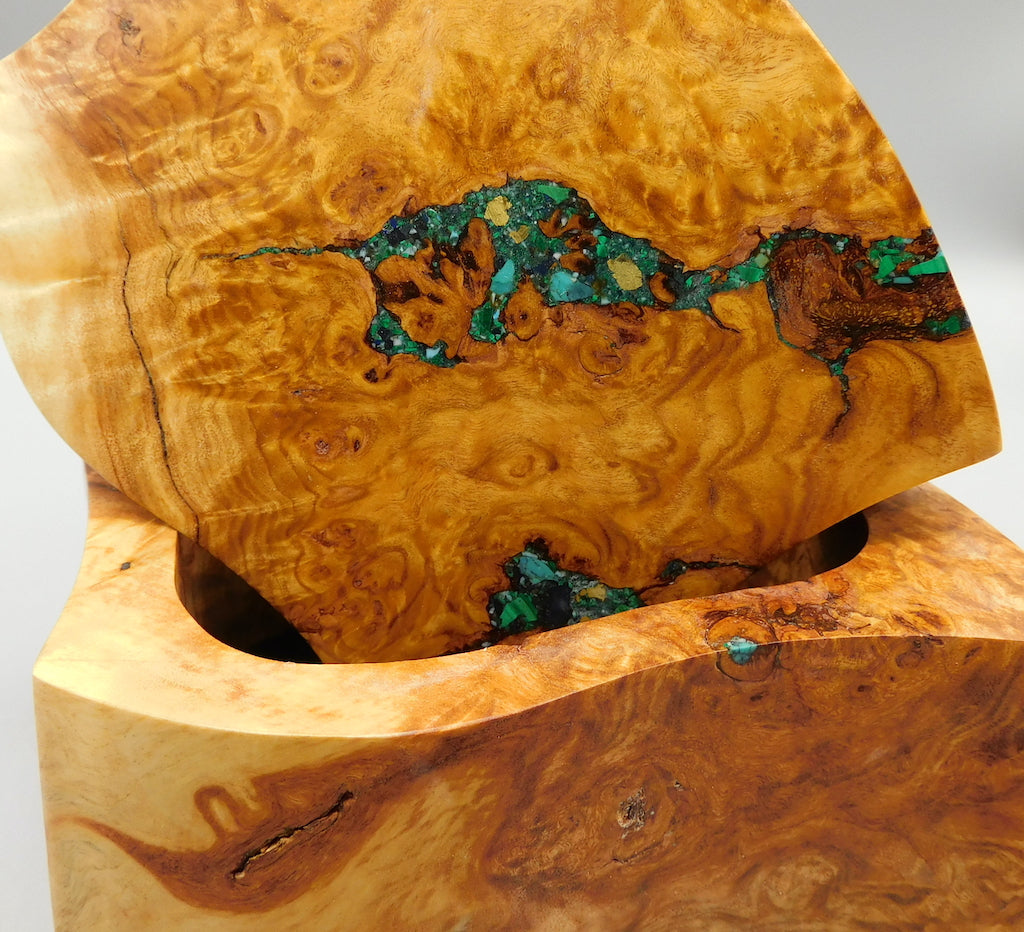 Inlaying requires painstakingly fitting small peices of semi-precious stone and metals into the natural gaps in the cut burl. The finished design must then be sanded and waxed many times to create a look and feel that is seamless and natural looking.