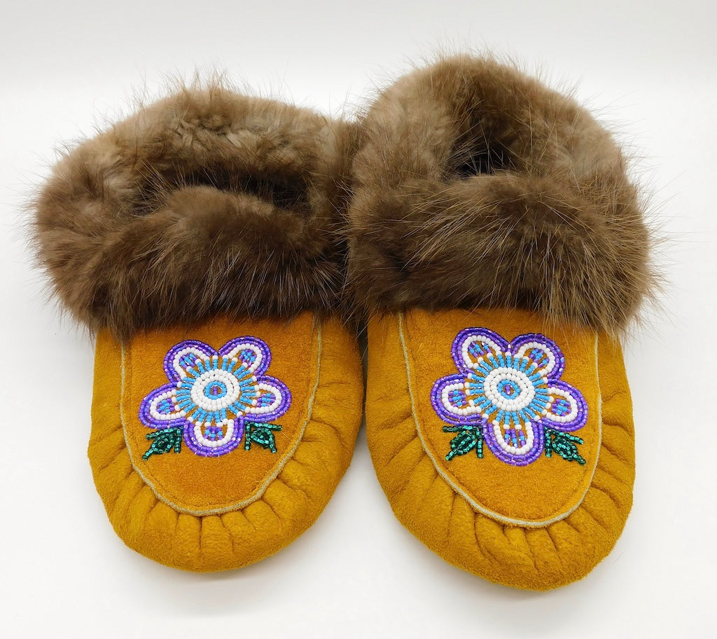 Ladies Beaded Moosehide Slippers - Flower Design Size 8
