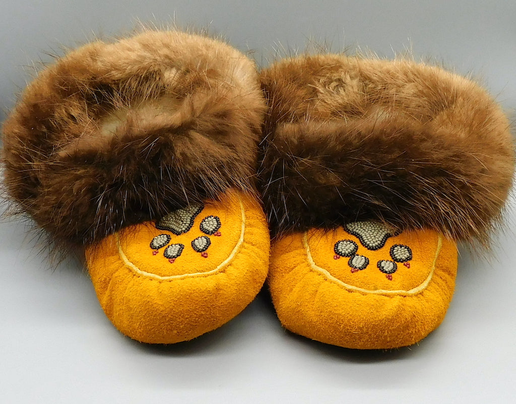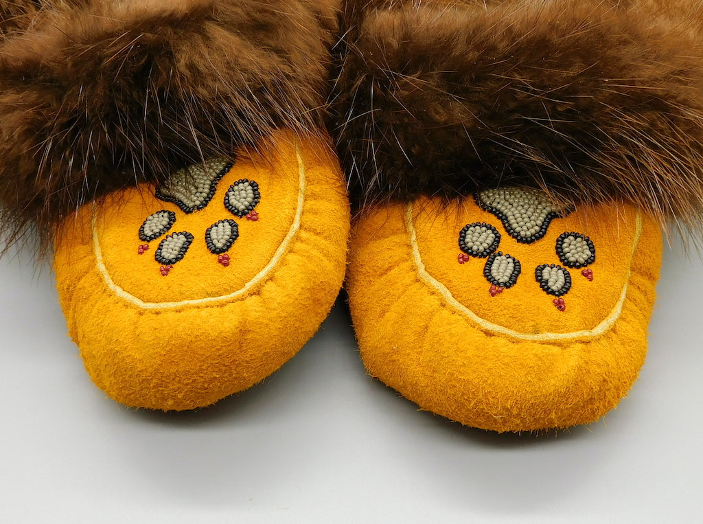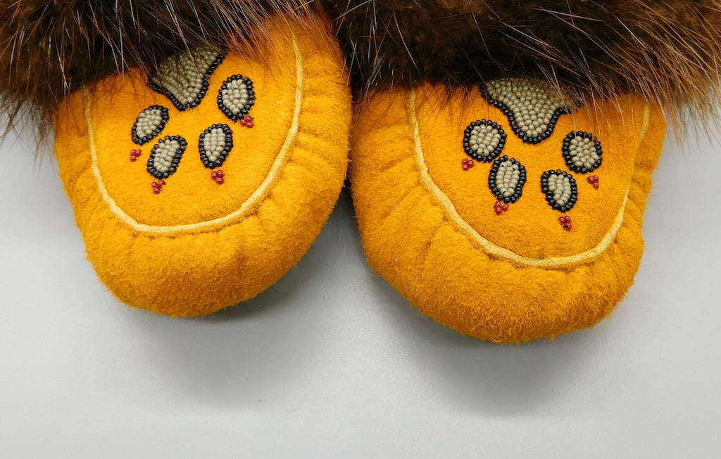 The word moccasin originates from the Algonquin language. This word was used by settlers and has come to refer to any kind of indigenous slipper. Each First Nation have their own style of slipper that have been in constant creation for generations, generally handed down through one generation teaching the next.