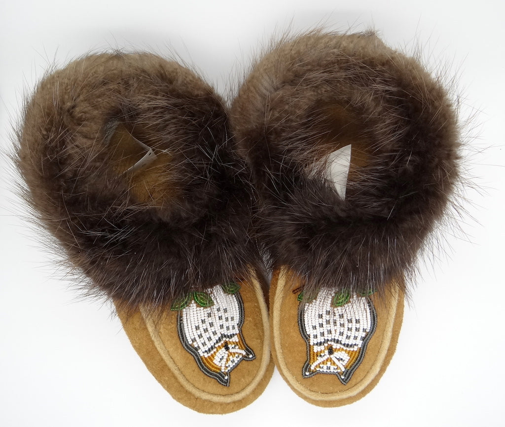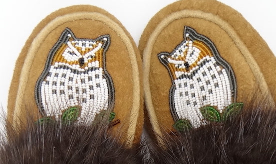 Ladies Beaded Moosehide Slippers-Owl Design-Grey Size 7