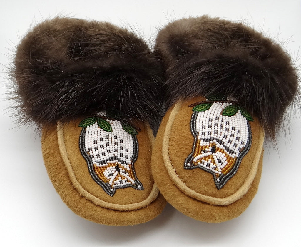 The word moccasin originates from the Algonquin language. This word was used by settlers and has come to refer to any kind of indigenous slipper. Each First Nation have their own style of slipper that have been in constant creation for generations, generally handed down through one generation teaching the next.