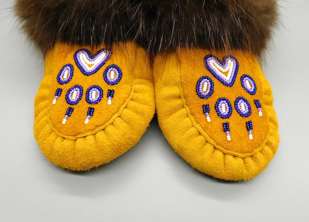The word moccasin originates from the Algonquin language. This word was used by settlers and has come to refer to any kind of indigenous slipper. Each First Nation have their own style of slipper that have been in constant creation for generations, generally handed down through one generation teaching the next.