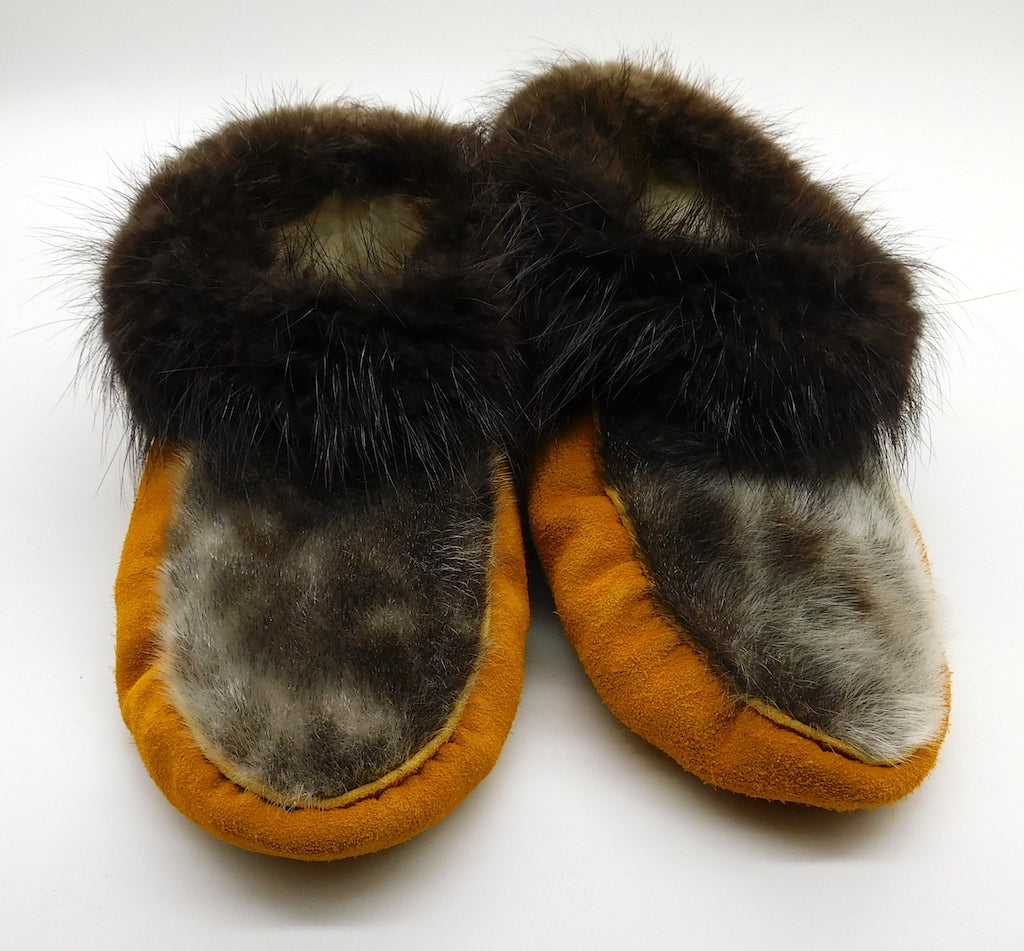The word moccasin originates from the Algonquin language. This word was used by settlers and has come to refer to any kind of indigenous slipper. Each First Nation have their own style of slipper that have been in constant creation for generations, generally handed down through one generation teaching the next.