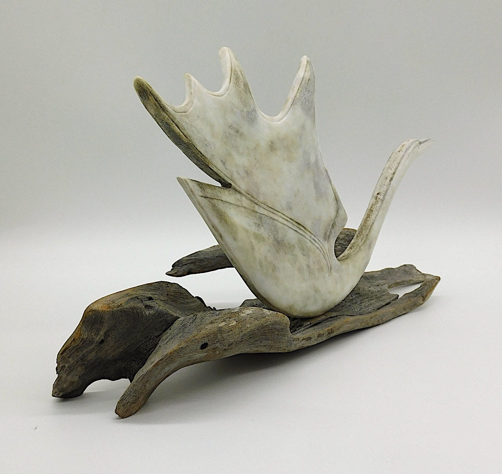 Maureen Morris has developed a very unique craft. Working in antler and bone, Maureen produces beautiful sculptures of considerable brilliance, both in design and in craftsmanship. In her strong graceful bird forms, Maureen demonstrates the carver’s unique ability to see one form inside another. A graduate of the Vancouver School of Art, Maureen initially came to the North to carve jade. However, she soon became fascinated with the potential of antler as a carving medium.